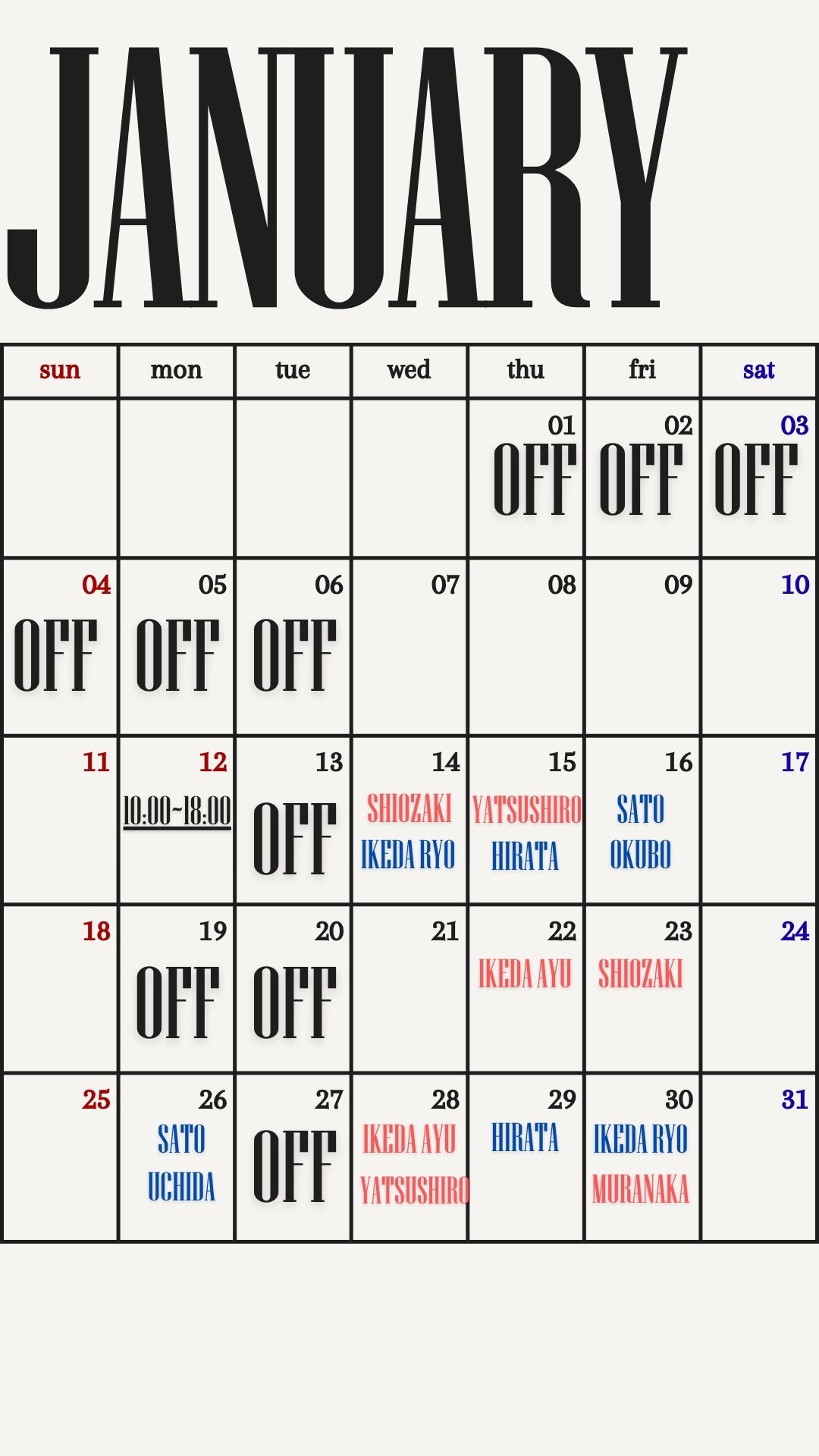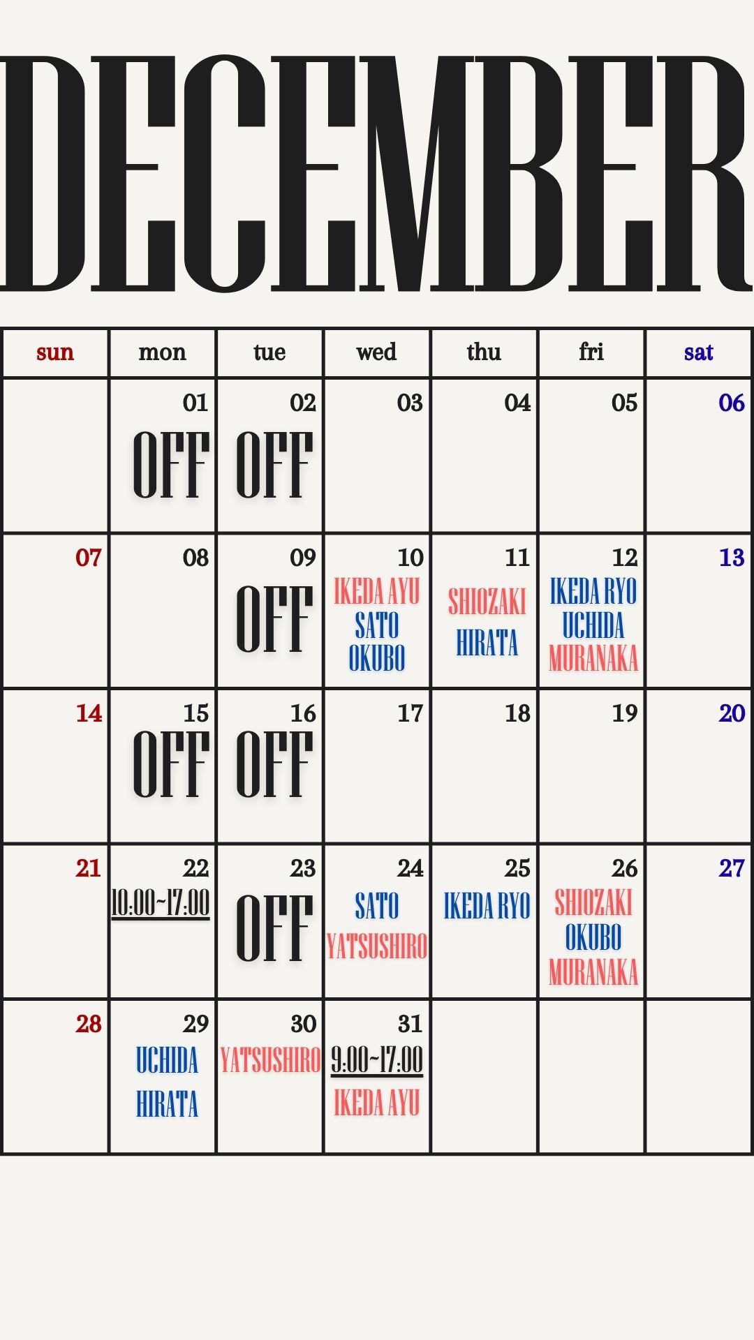 定休日・各スタイリストのお休み