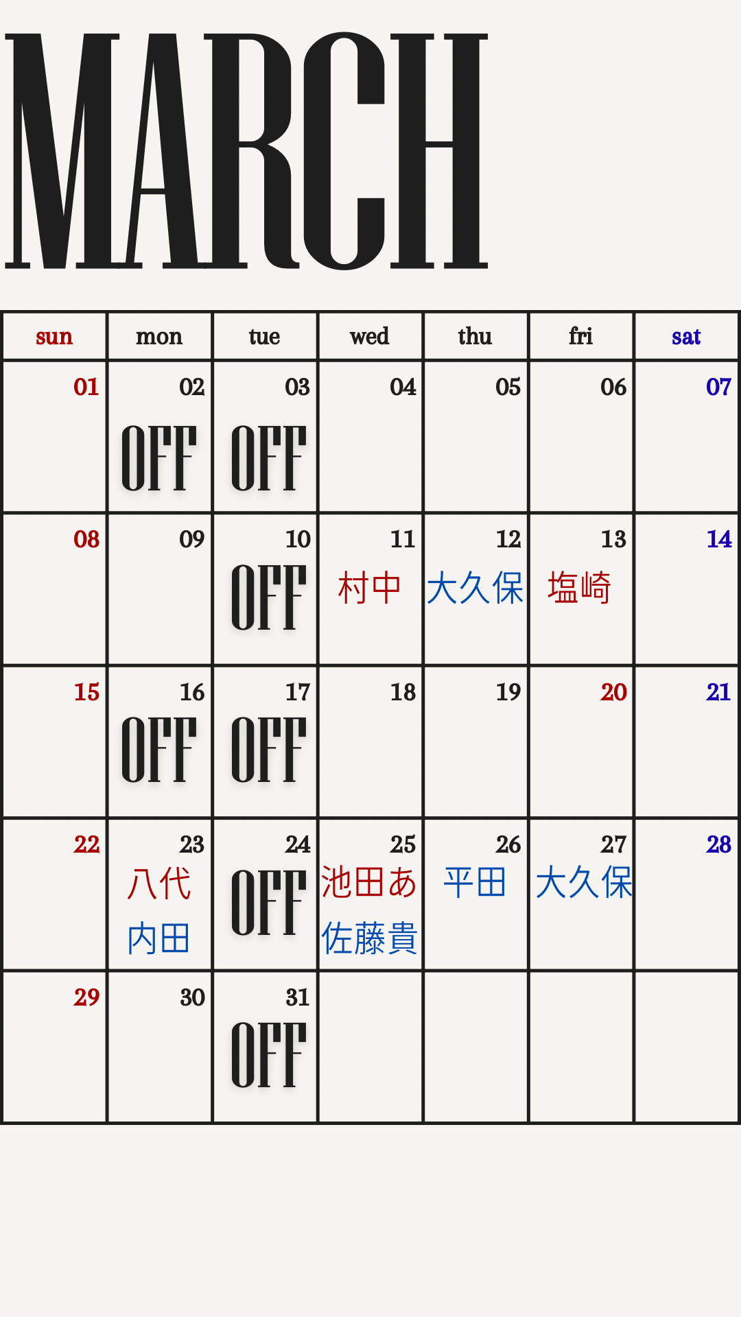 定休日・各スタイリストのお休み